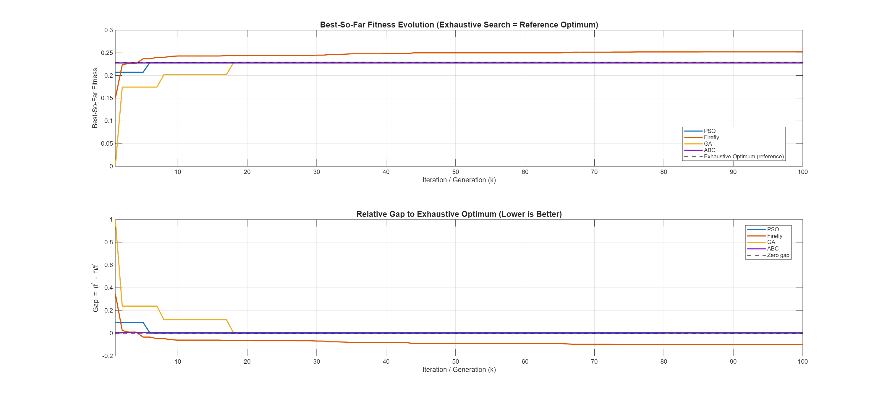 Engineering-oriented comparison of convergence behavior and computational efficiency using a reference exhaustive search.